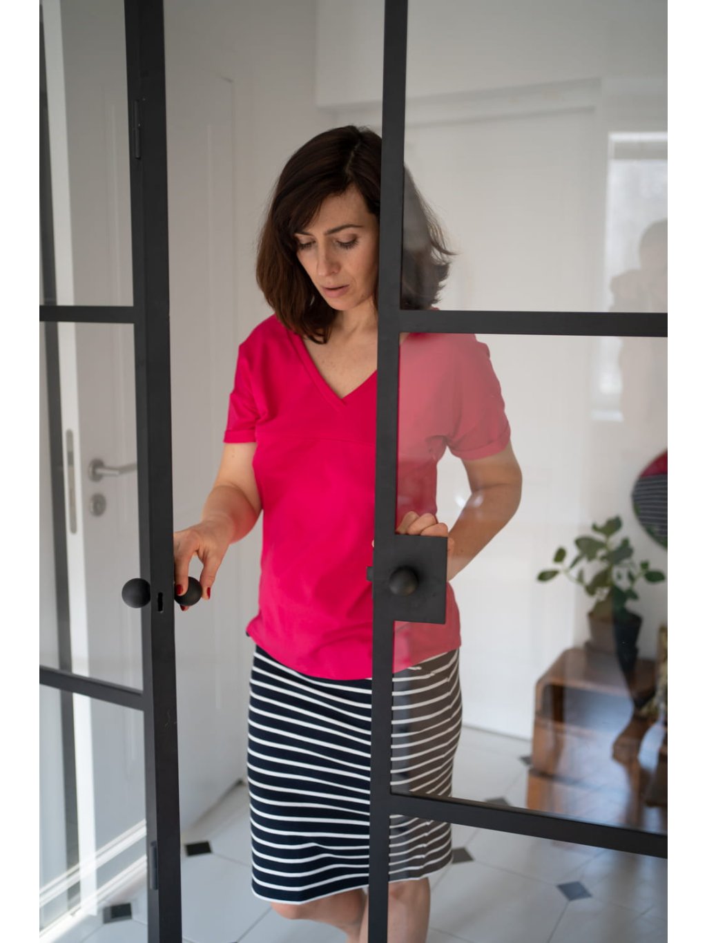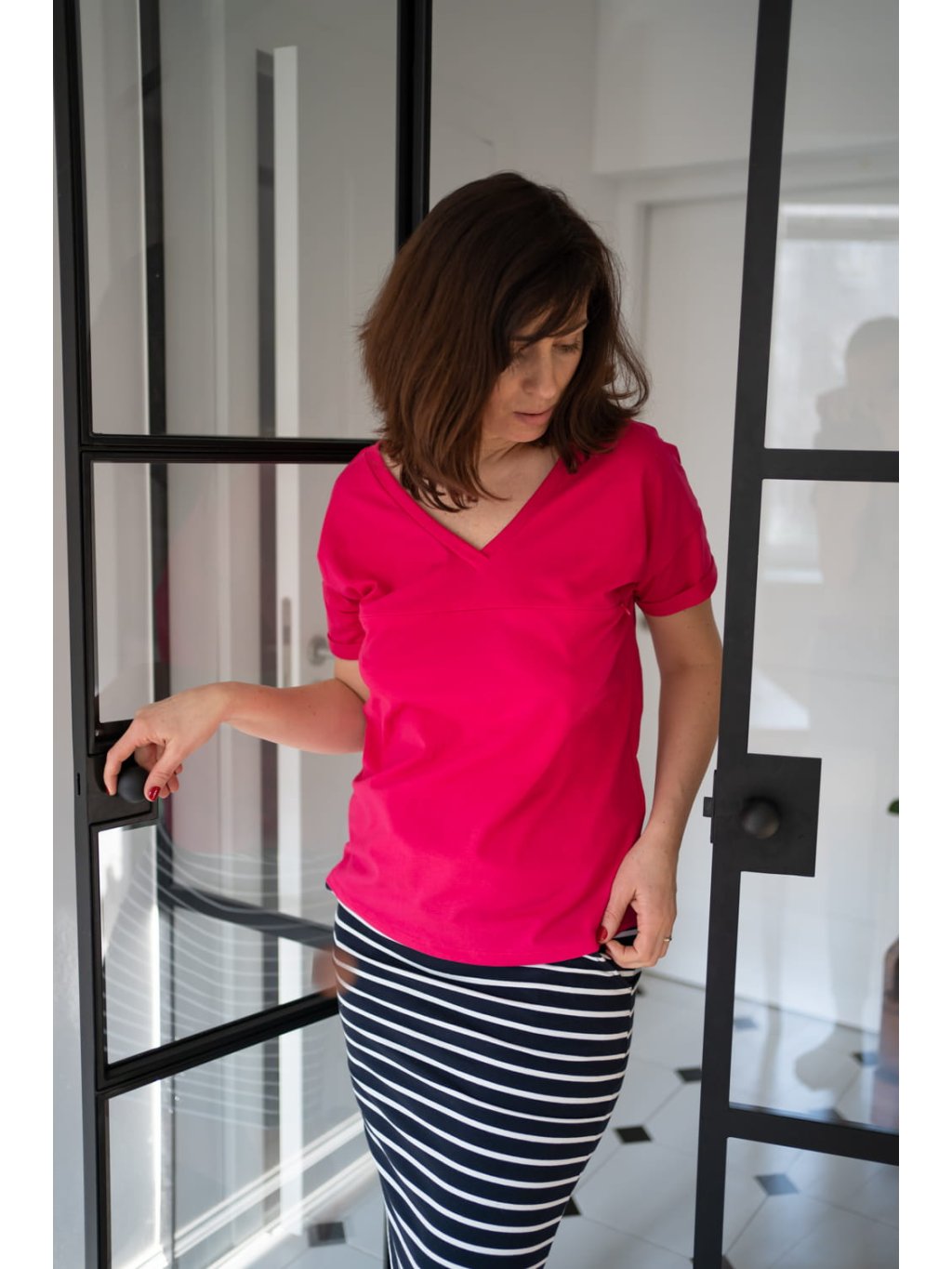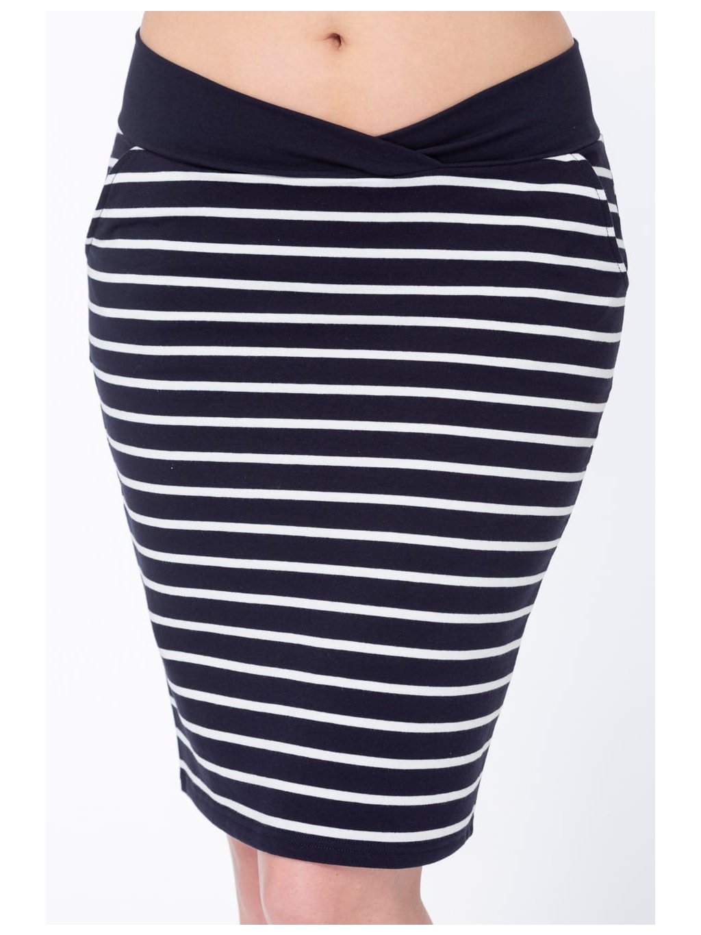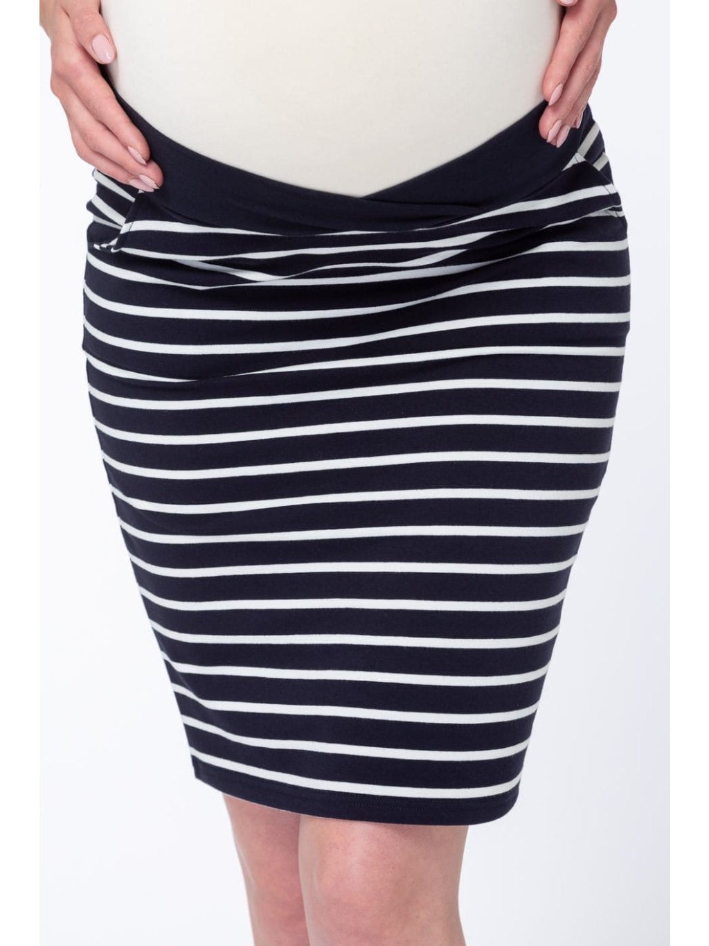 Při výběru velikosti se řiďte velikostí, kterou právě nosíte. Sukně je vyrobena z elastického úpletu a krásně se přizpůsobí těhotenskému bříšku a měnícím se tvarům postavy.