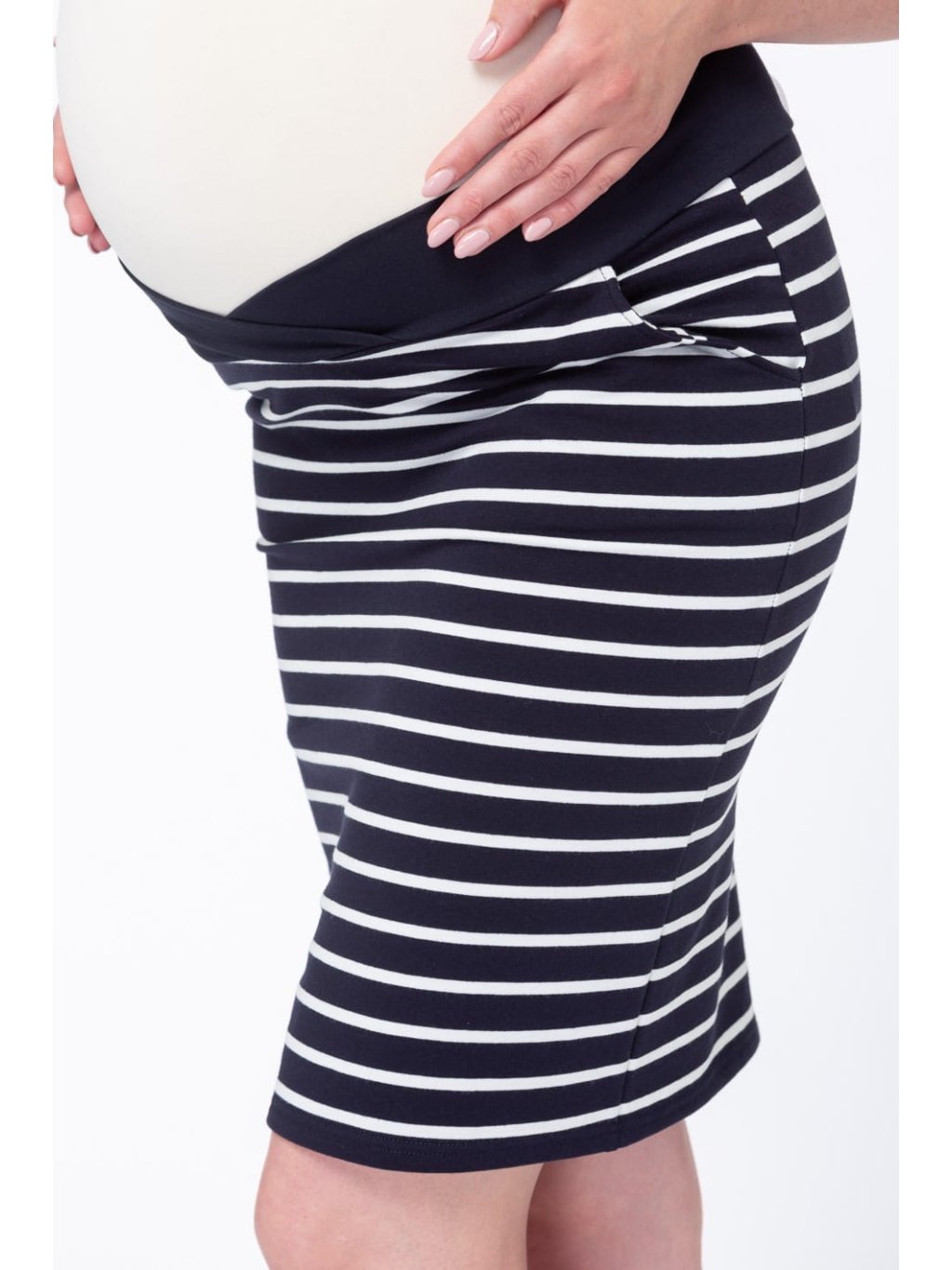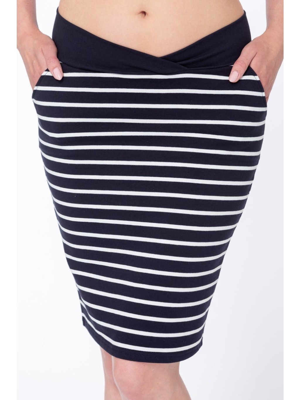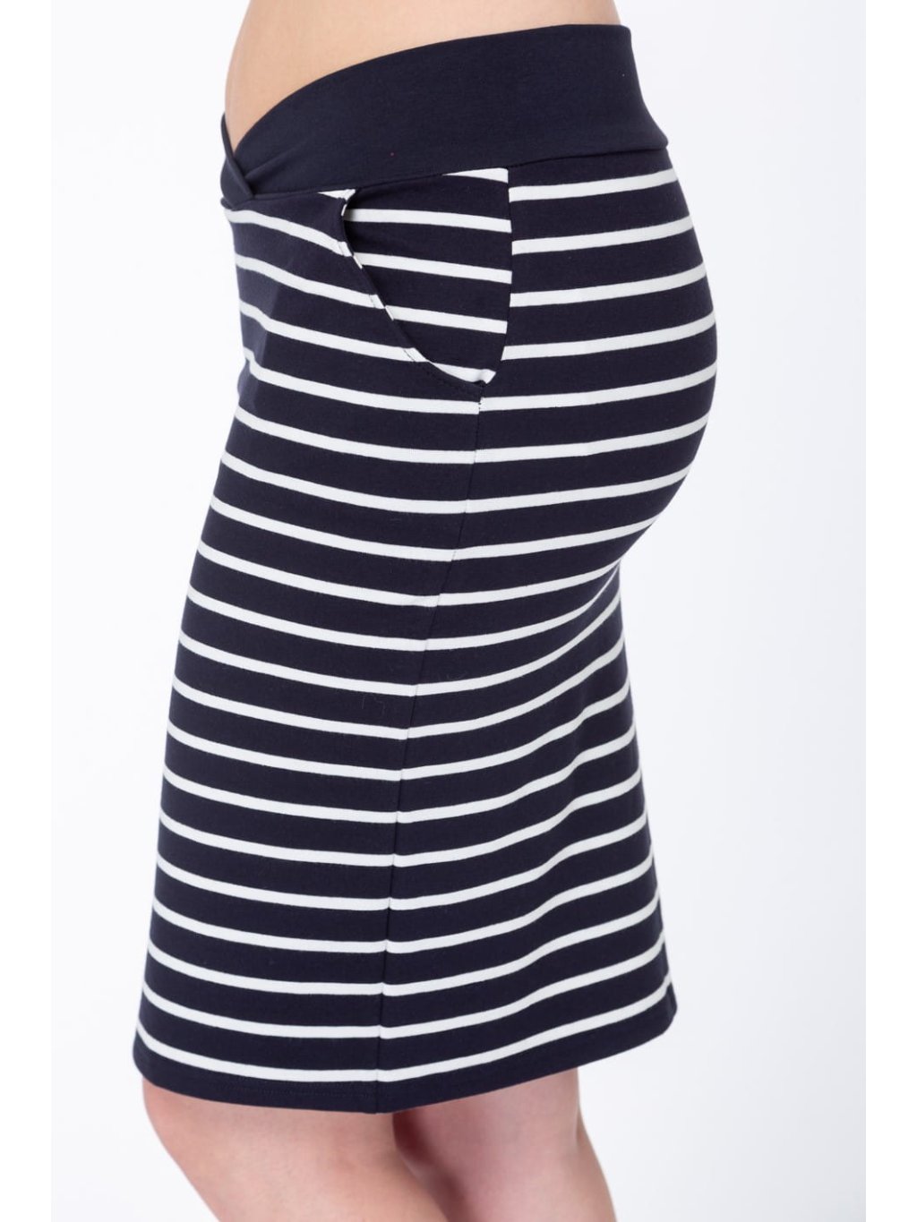 Bavlněná, těhotenská sukně s nízkým pasem a kapsami modrá s bílými proužky