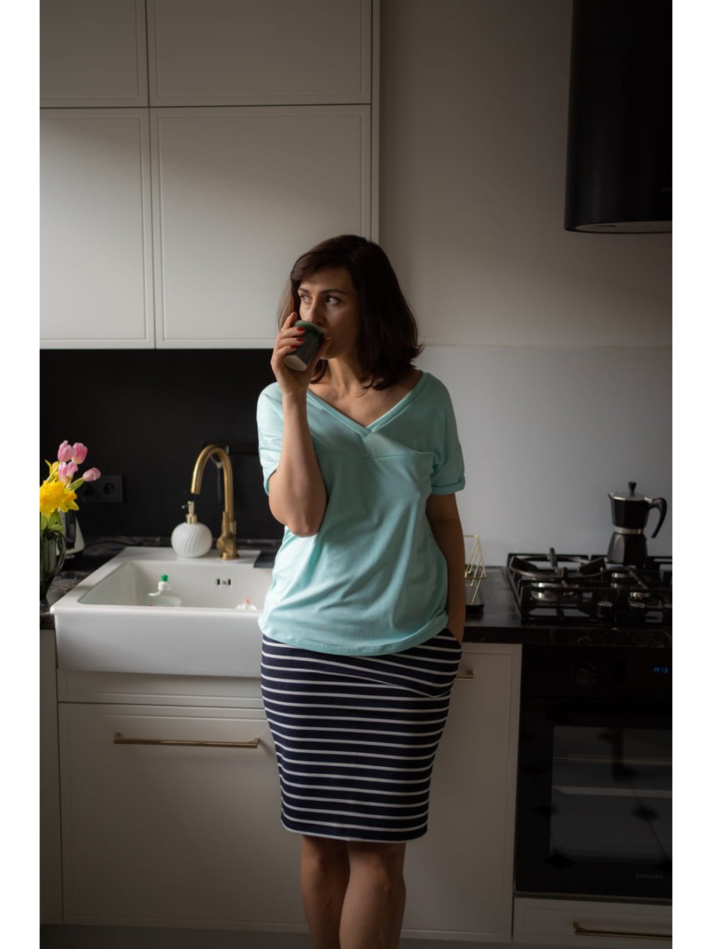 Těhotenská sukně s kapsami je skvělým základem pro těhotenský styl. Lze ji nosit každý den s teniskami, balerínkami, nebo s podpatky. Měkký úplet netlačí a umožňuje volnost pohybu. Nízký pas ve tvaru rybí kosti je mimořádně pohodlný, protože nedráždí pokožku na bříšku, která je během těhotenství obzvláště citlivá. Po těhotenství můžete i nadále nosit sukni s krátkým pasem jako běžné oblečení!