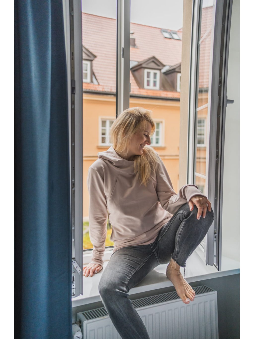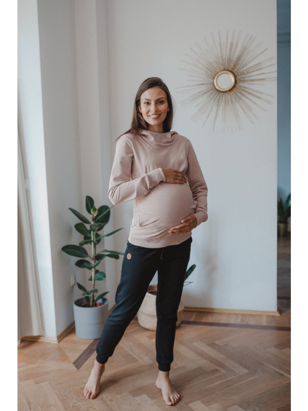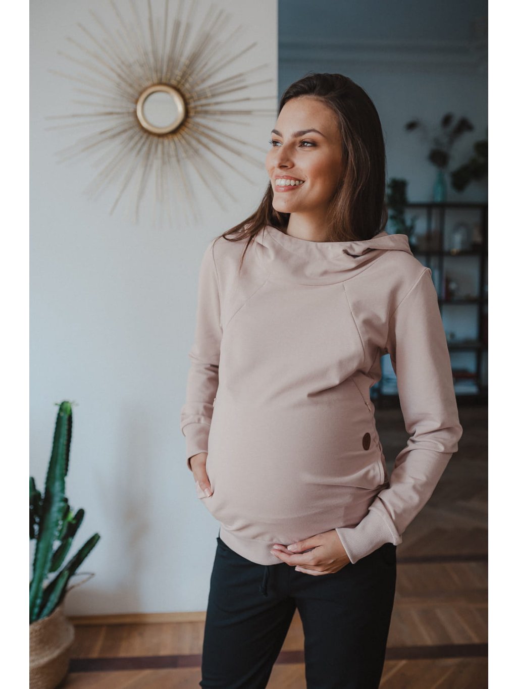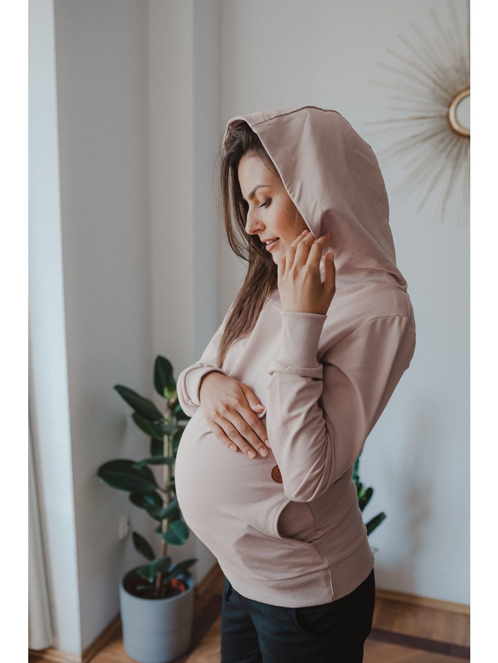Tato mikina je navržena tak, aby se přirozeně přizpůsobila rostoucímu těhotenskému bříšku a zároveň zůstala krásná i po porodu. Díky pružnému úpletu drží tvar a nepůsobí vytahaně – můžete ji nosit každý den a po narození miminka jako pohodlnou kojicí mikinu.