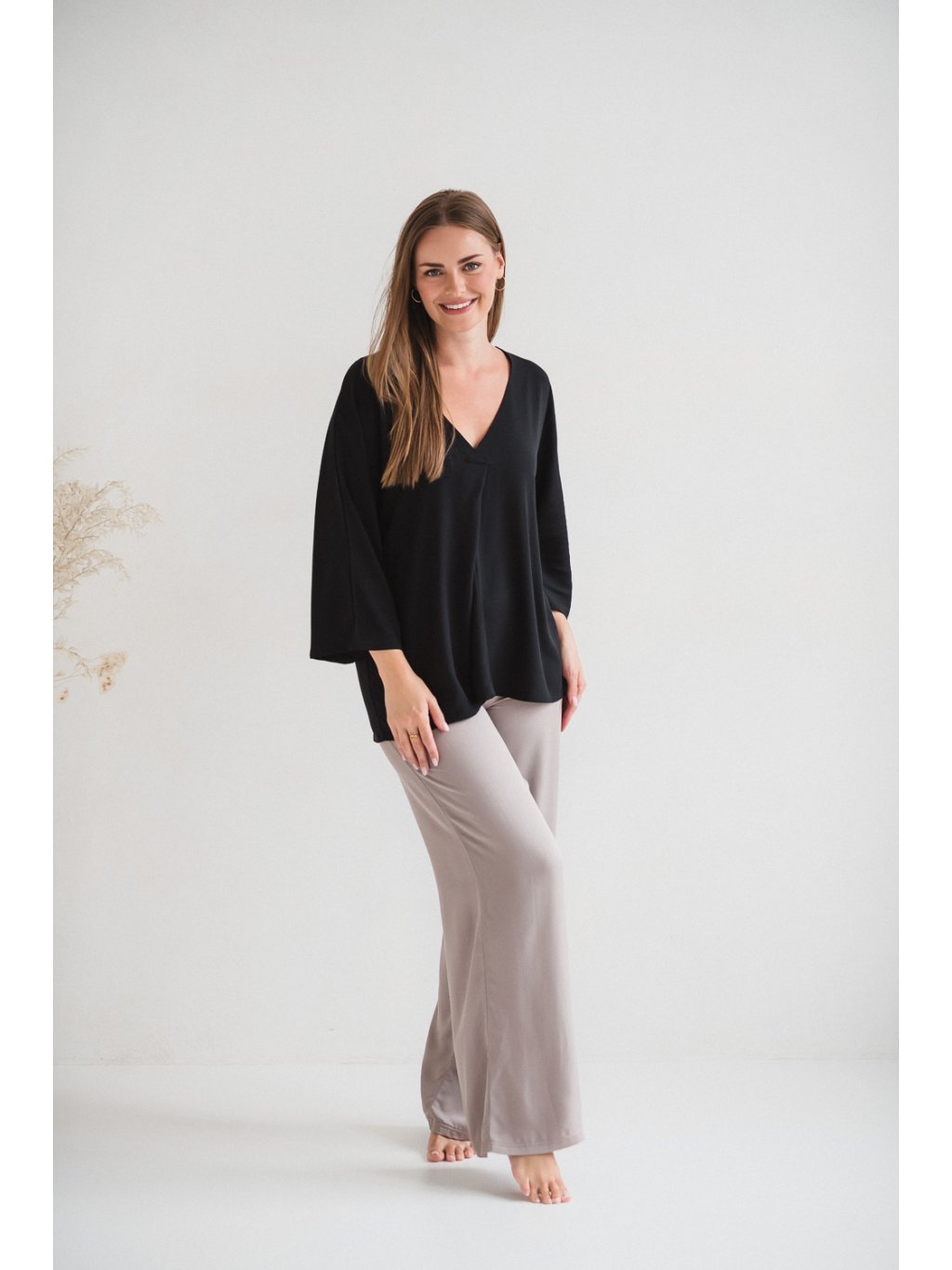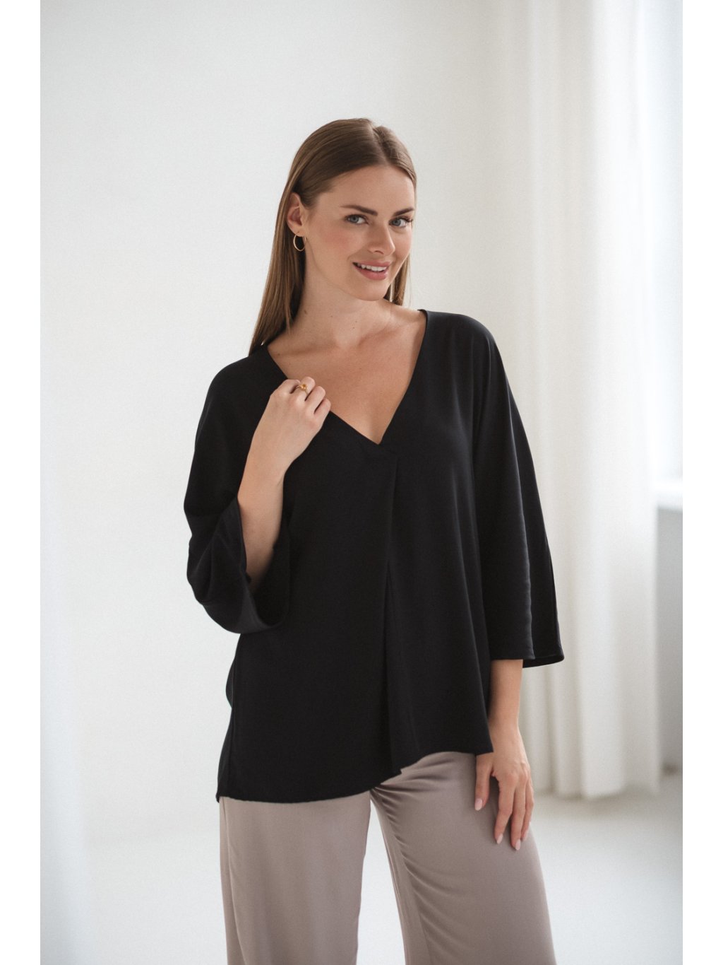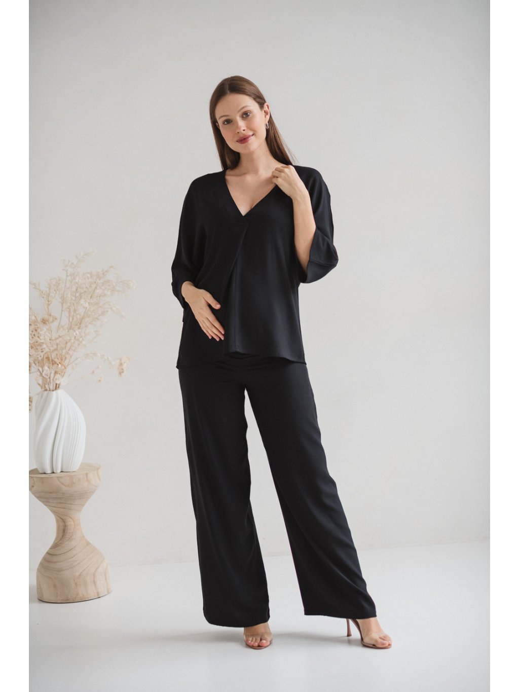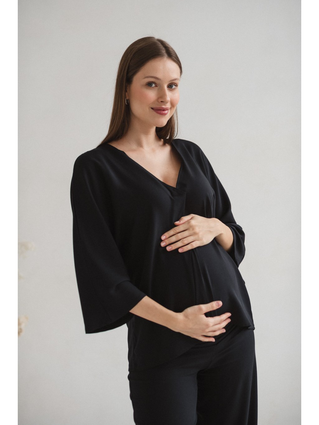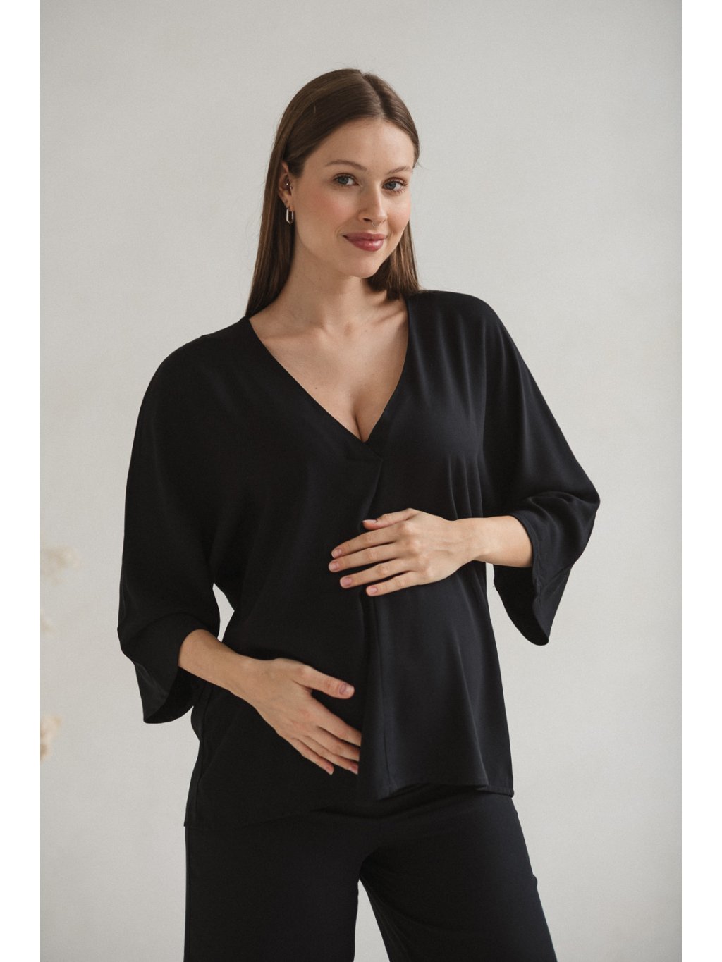 Tento model se vyznačuje výrazným kimonovým střihem s širokými rukávy, které mu dodávají lehkou a uvolněnou siluetu. Nadměrný střih byl navržen tak, aby poskytoval prostor těhotenskému bříšku, aniž by ho stahoval nebo omezoval v pohybu. Tato halenka kombinuje moderní, jednoduchý design s funkčností potřebnou během těhotenství a kojení.