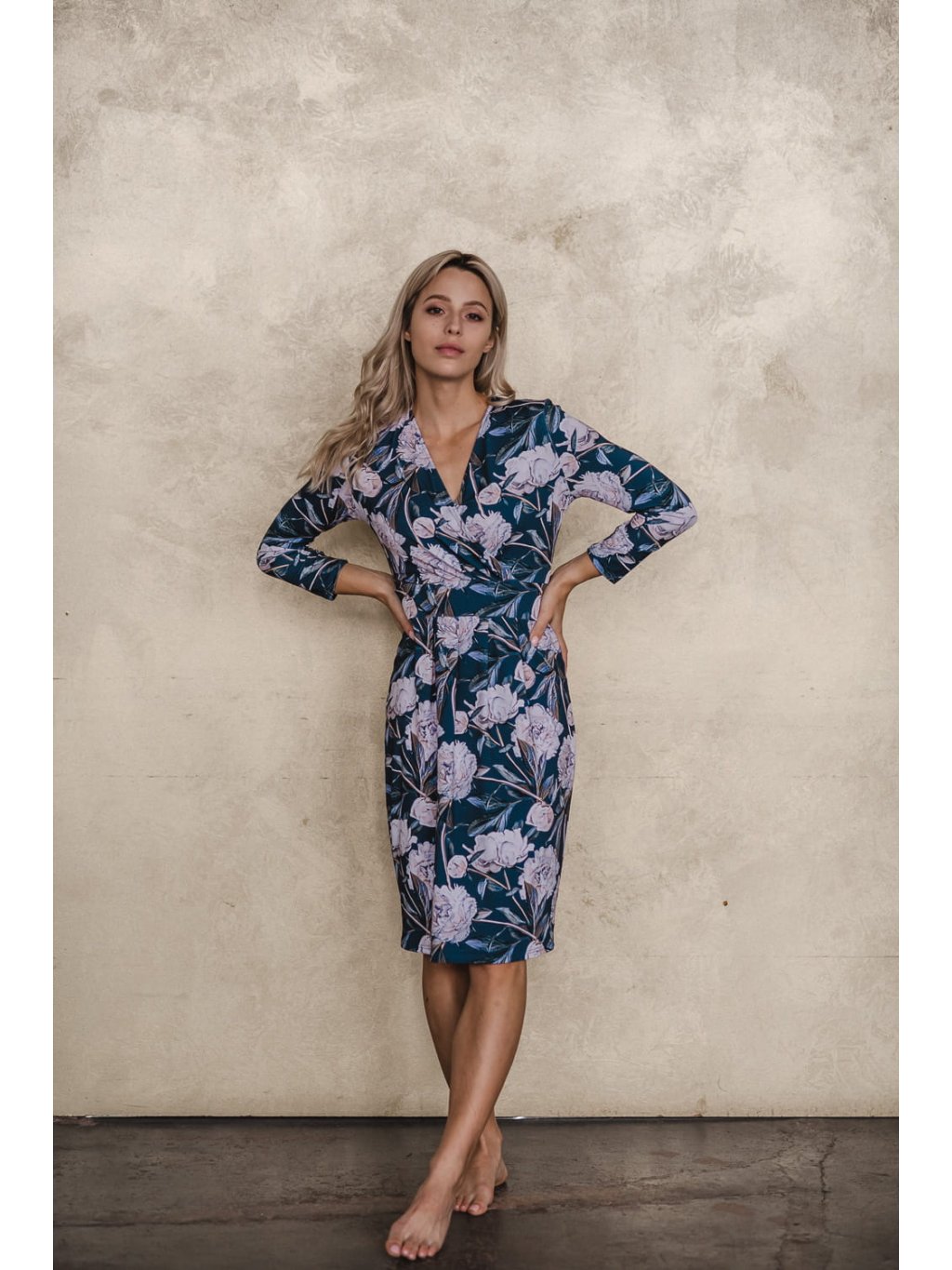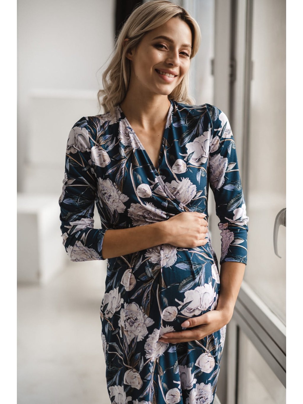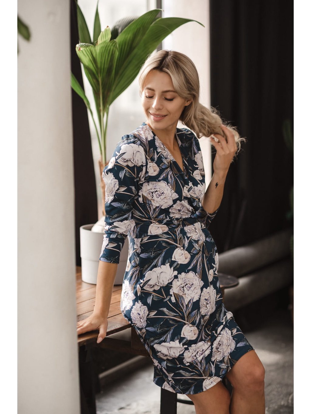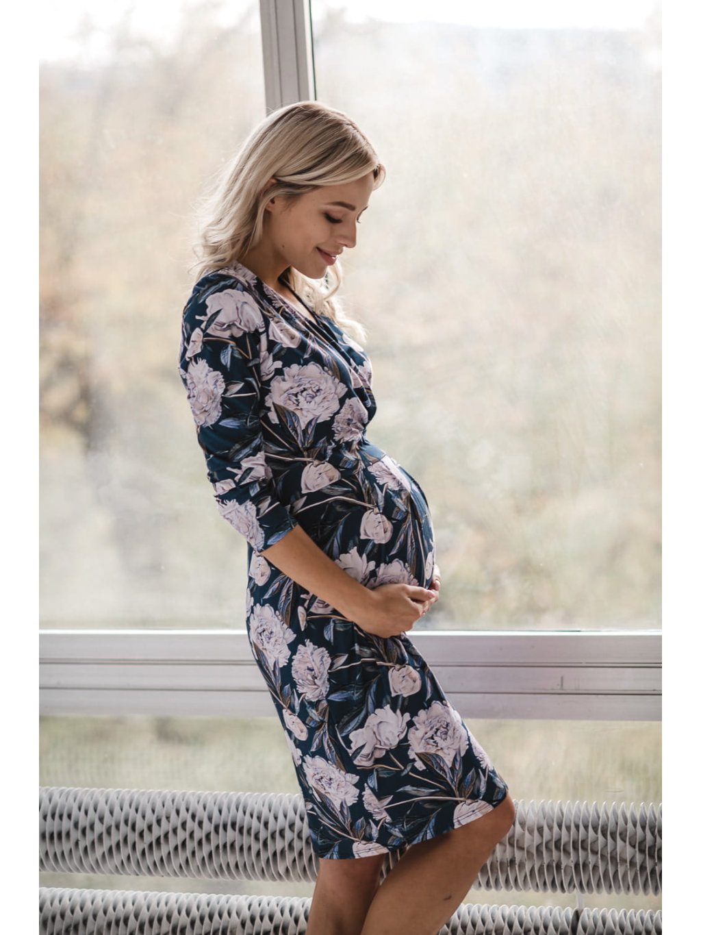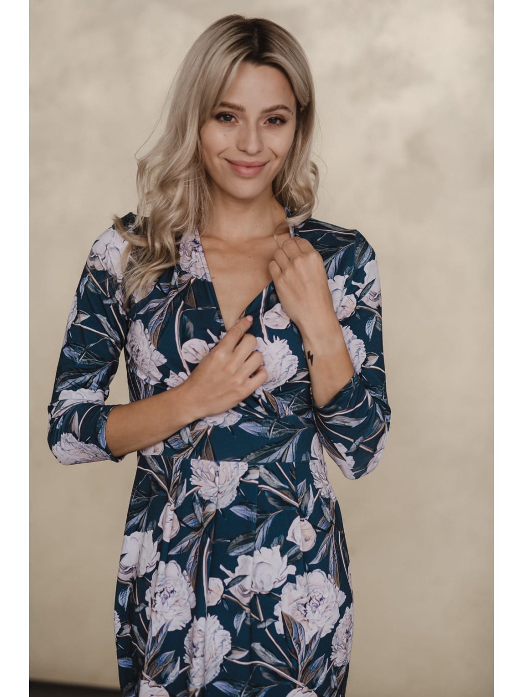 Těhotenské a kojící šaty Grow with me modré s pivoňkami 7/8 rukáv