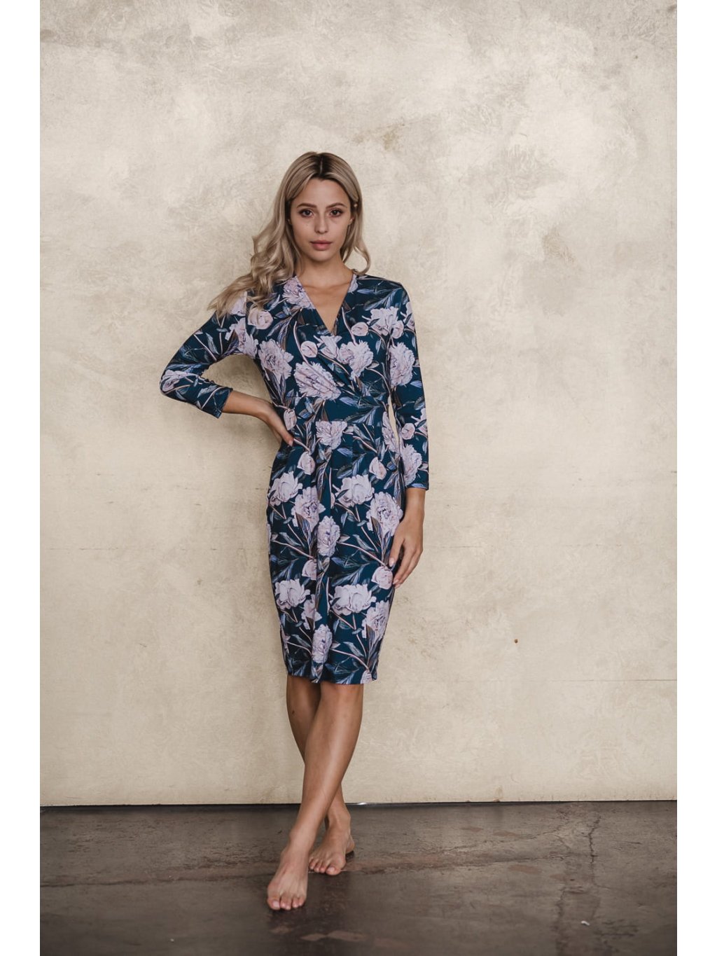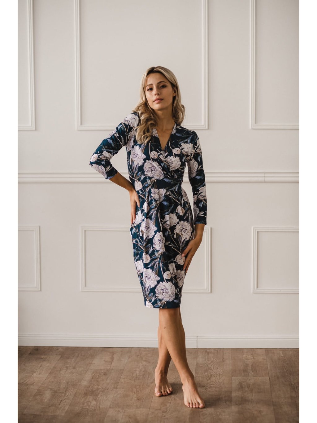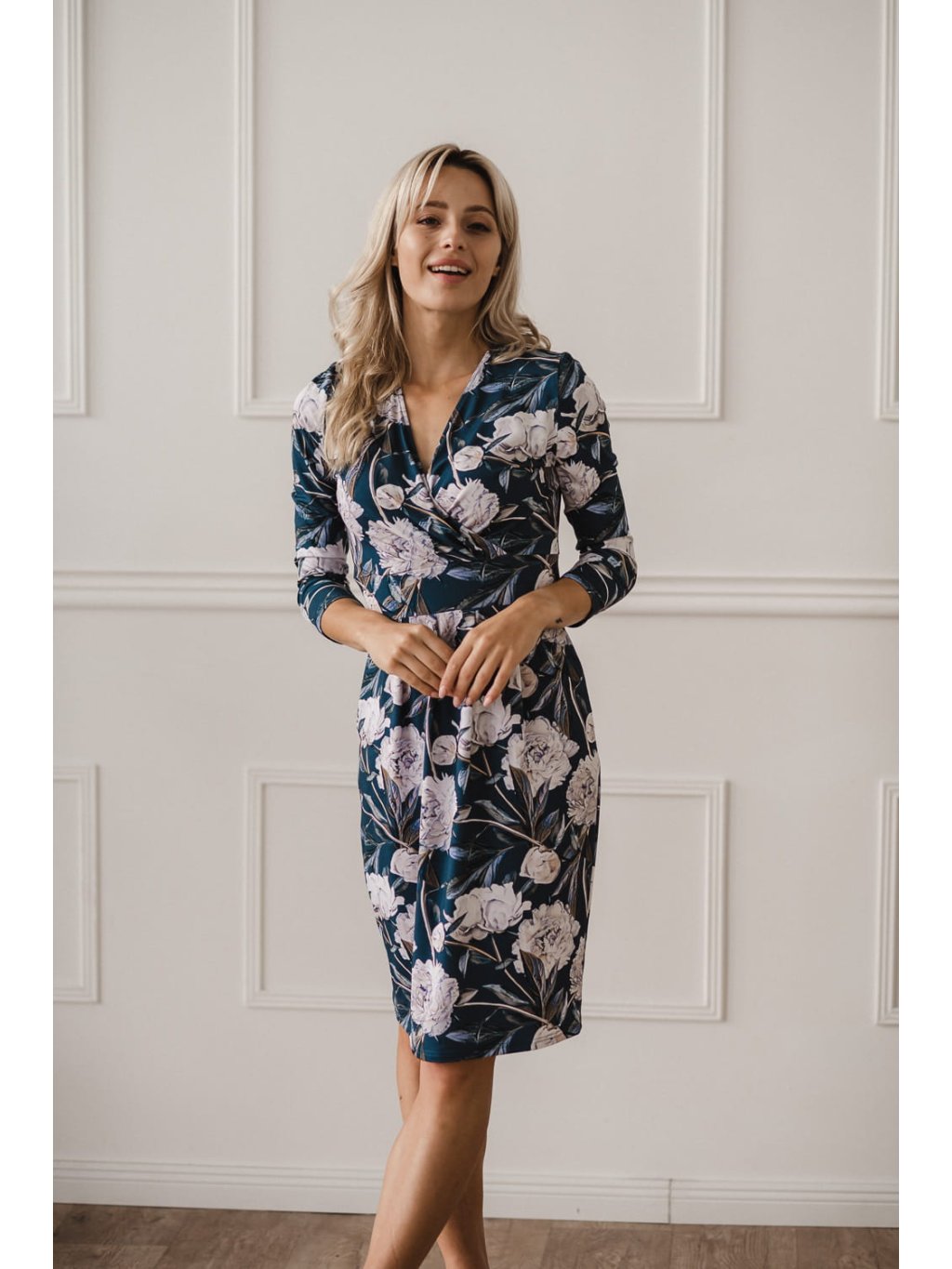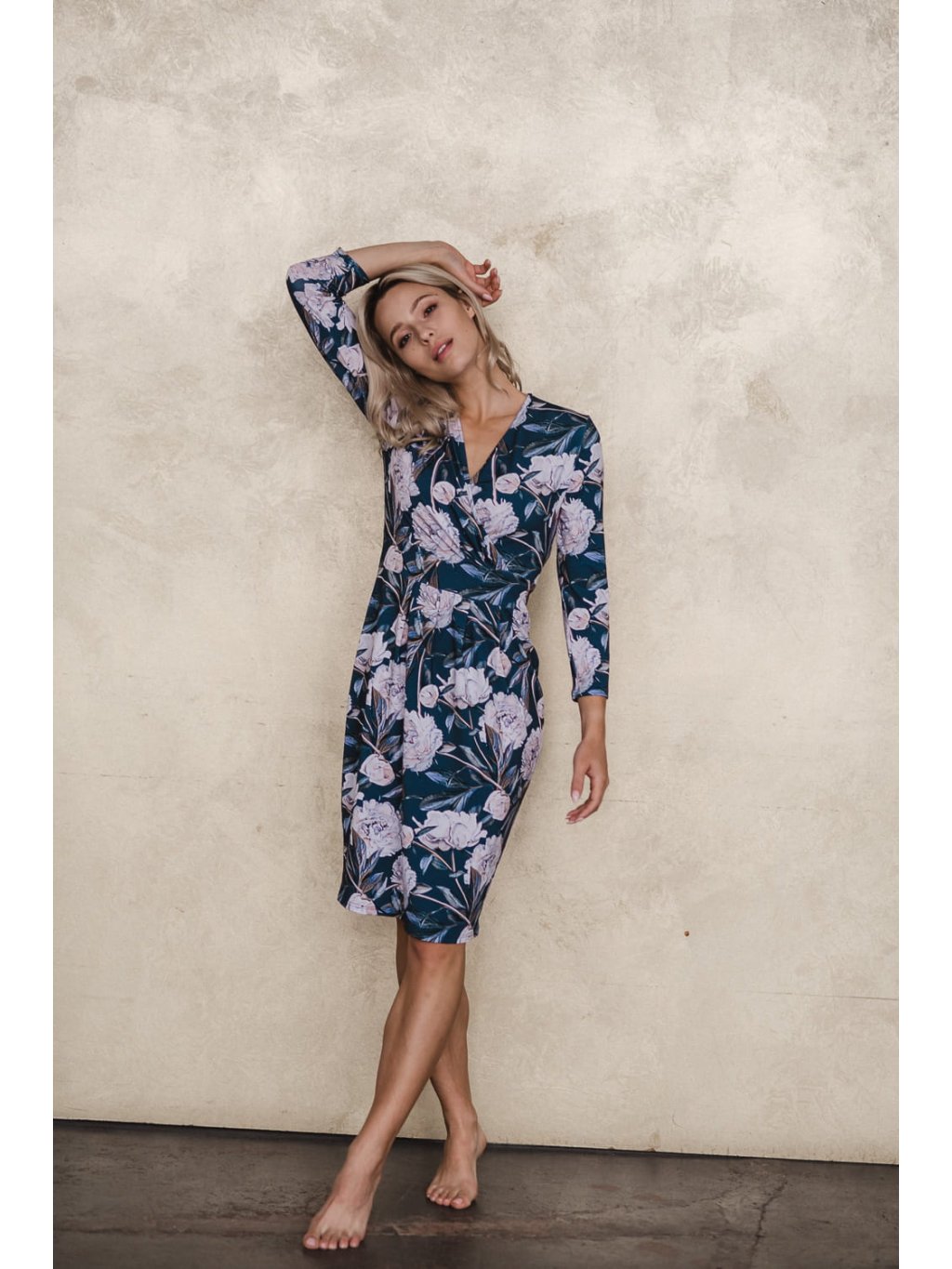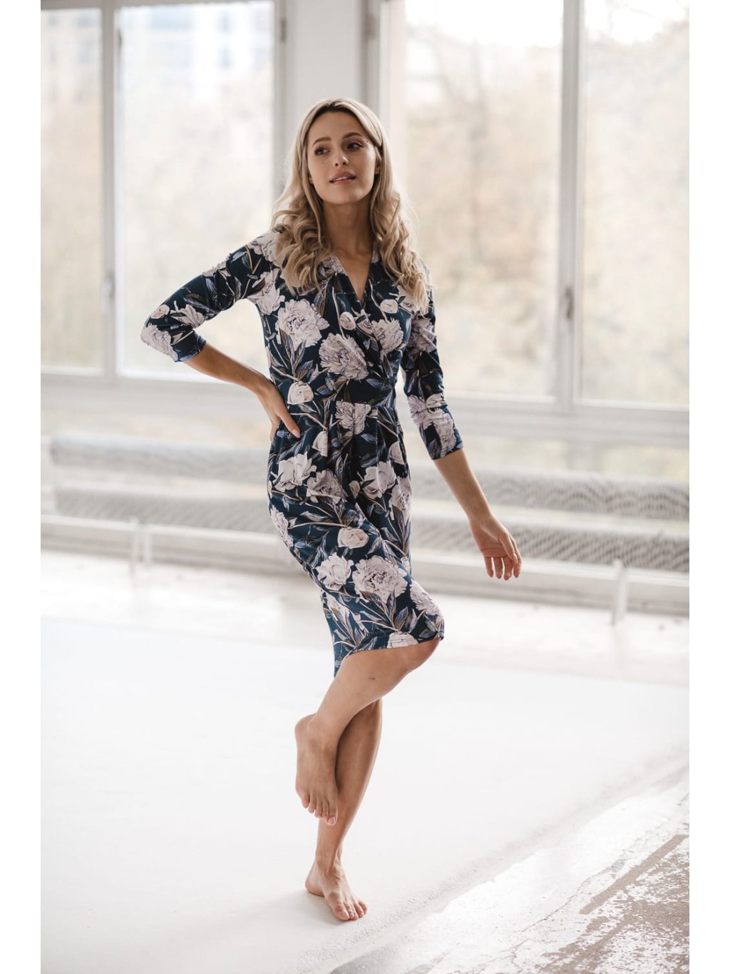 Těhotenské a kojící šaty Grow with me modré s pivoňkami 7/8 rukáv