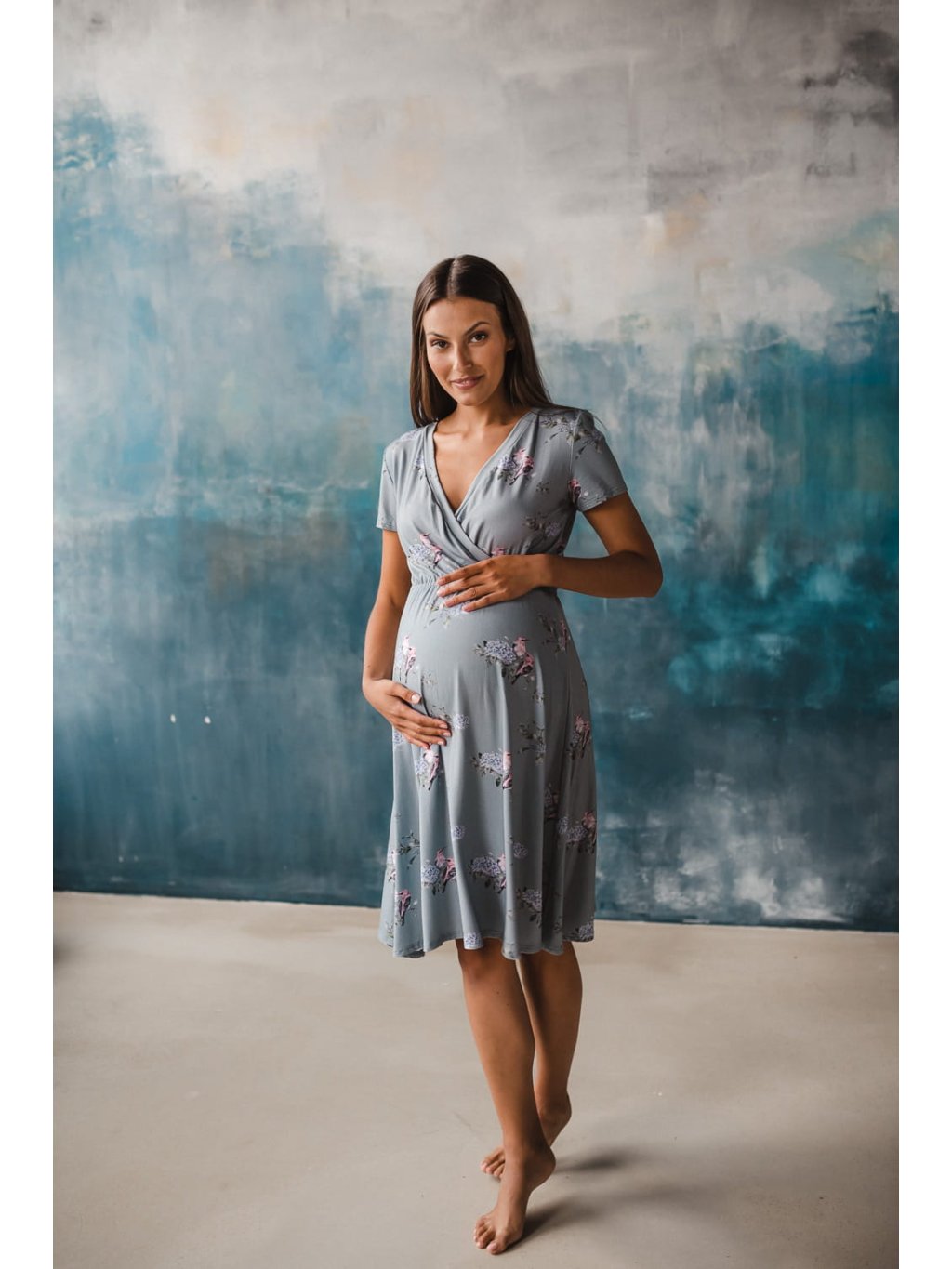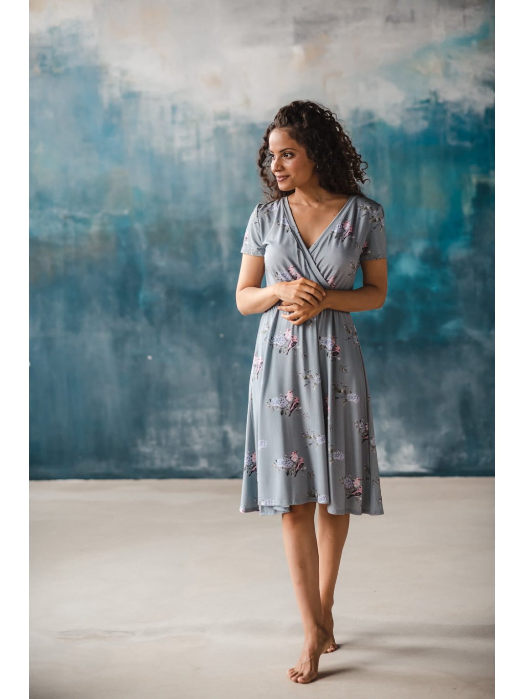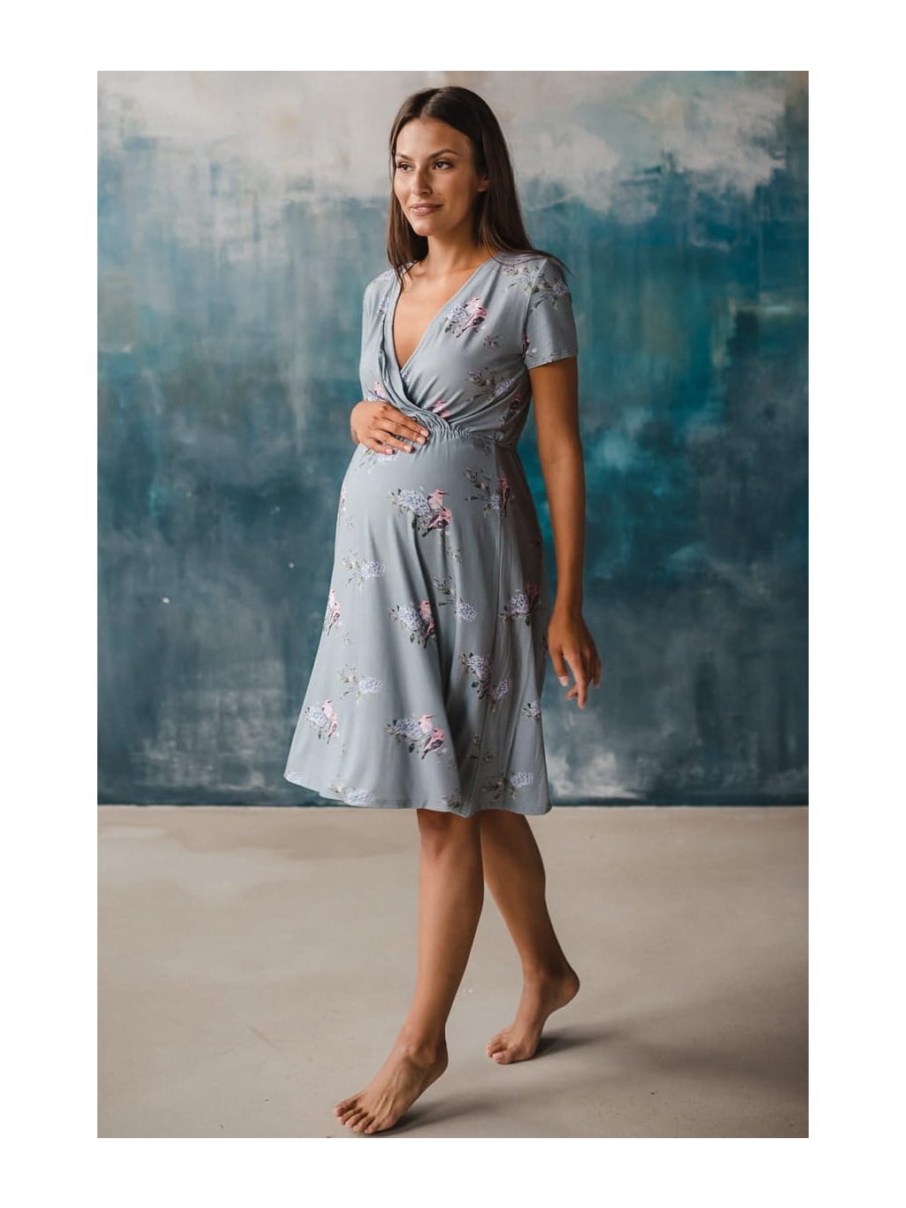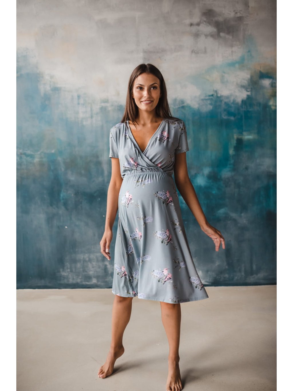 Těhotenské a kojící šaty Two ways MIDI eukalypt hortenzie krátký rukáv